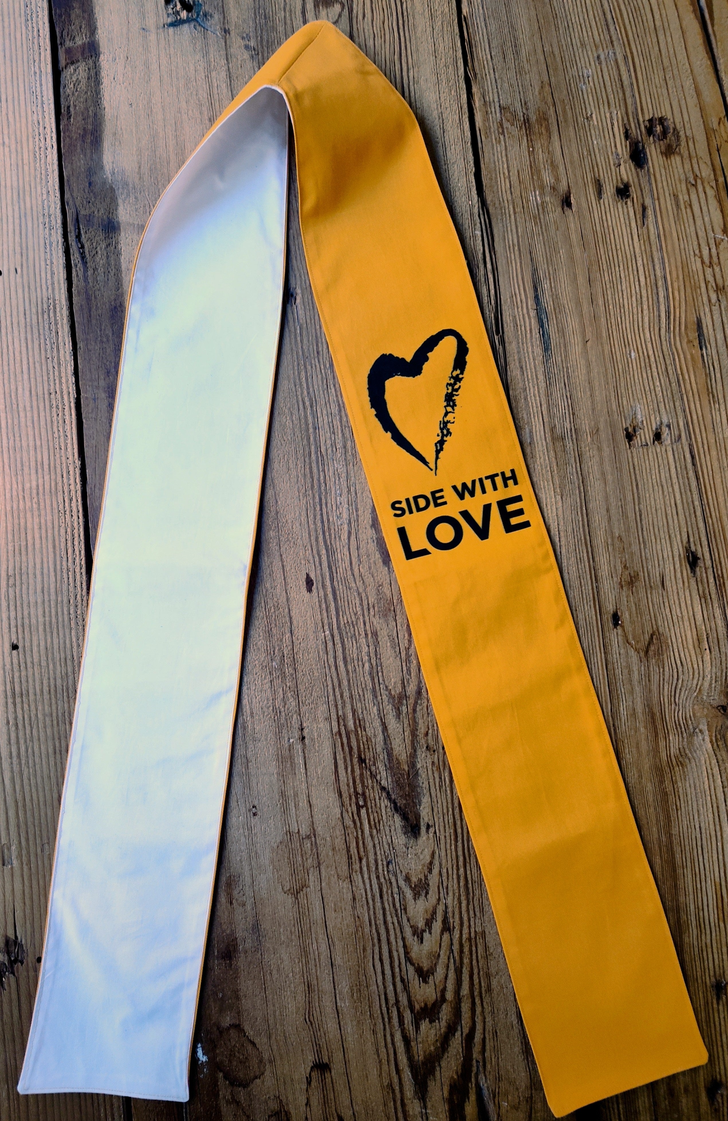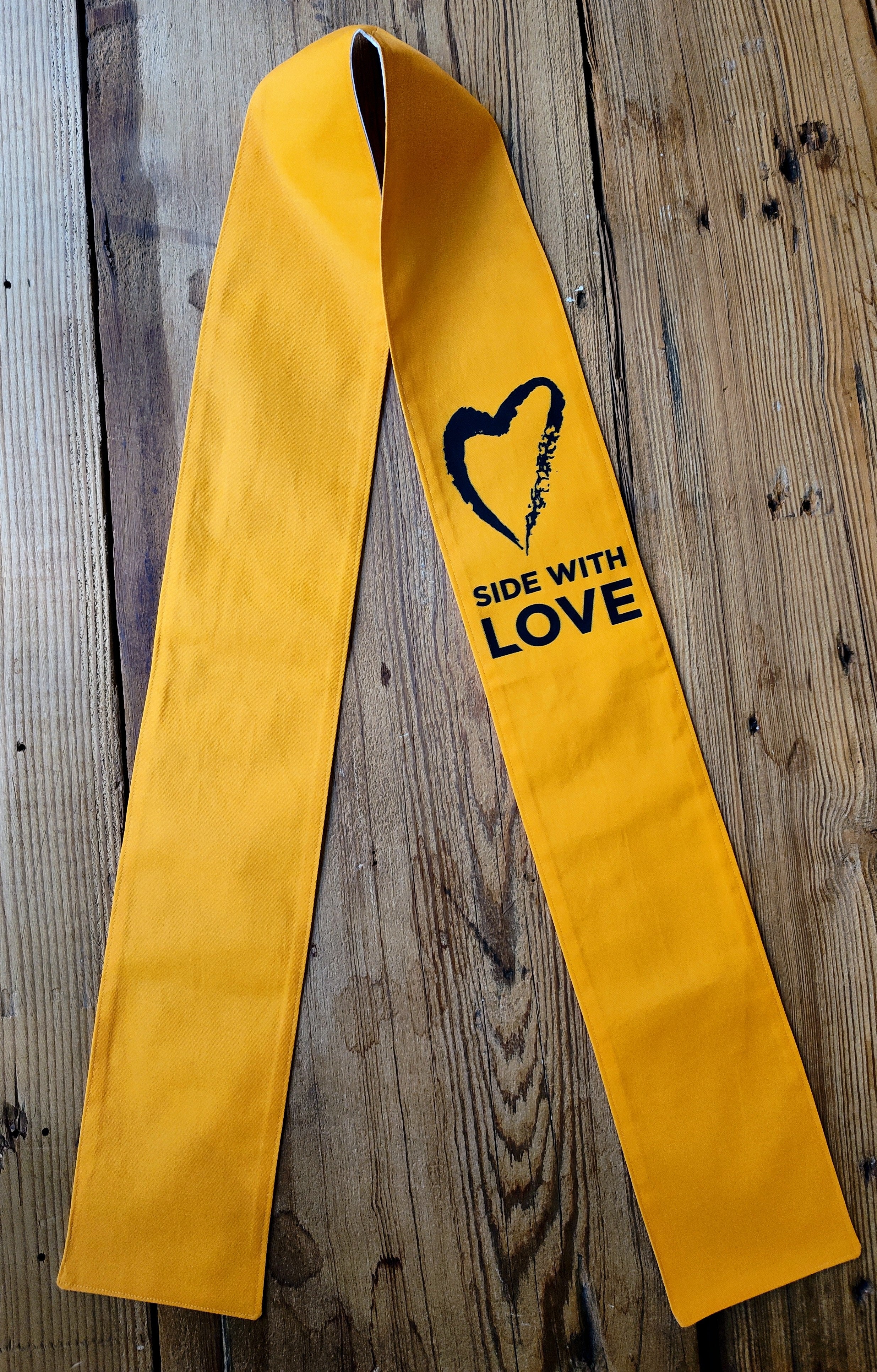 The Side With Love Protest Stole from Jeff Wunrow Designs is 32” long, measured from the center back neck, and 5” wide on each side. 100% cotton printed twill and lining.