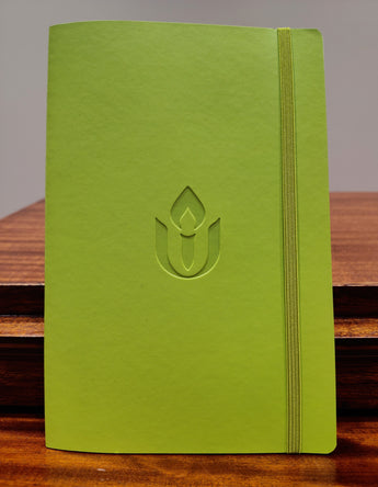 A green, soft covered journal embossed with the chalice. Contains 128 ivory lined pages made with acid free paper and an interior pocket to hold loose documents. An elastic closure secures the pages between uses. Perfect for everyday note taking, writing projects, journal entries, and more. Size: 8-1/4" x 5-1/2" x 7/16".