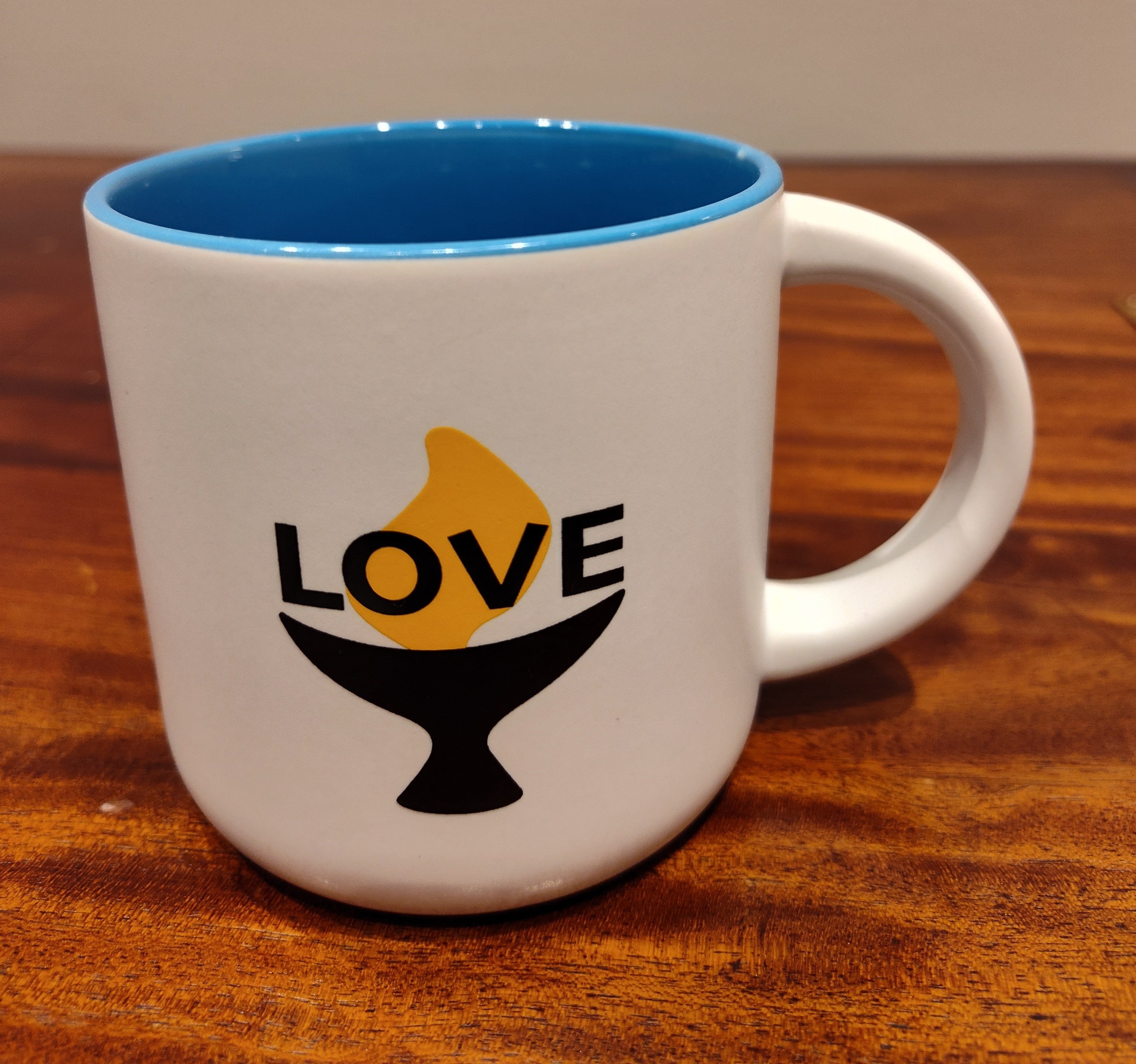 This lovably attractive, sturdy, 14-oz ceramic Minolo mug features a matte white exterior; a glossy blue interior, and our Tanya Webster-designed “love chalice” in black and yellow – emphasizing that love is at the center of our shared Unitarian Universalist values. Complete with a large, curved handle for a comfortable grip.