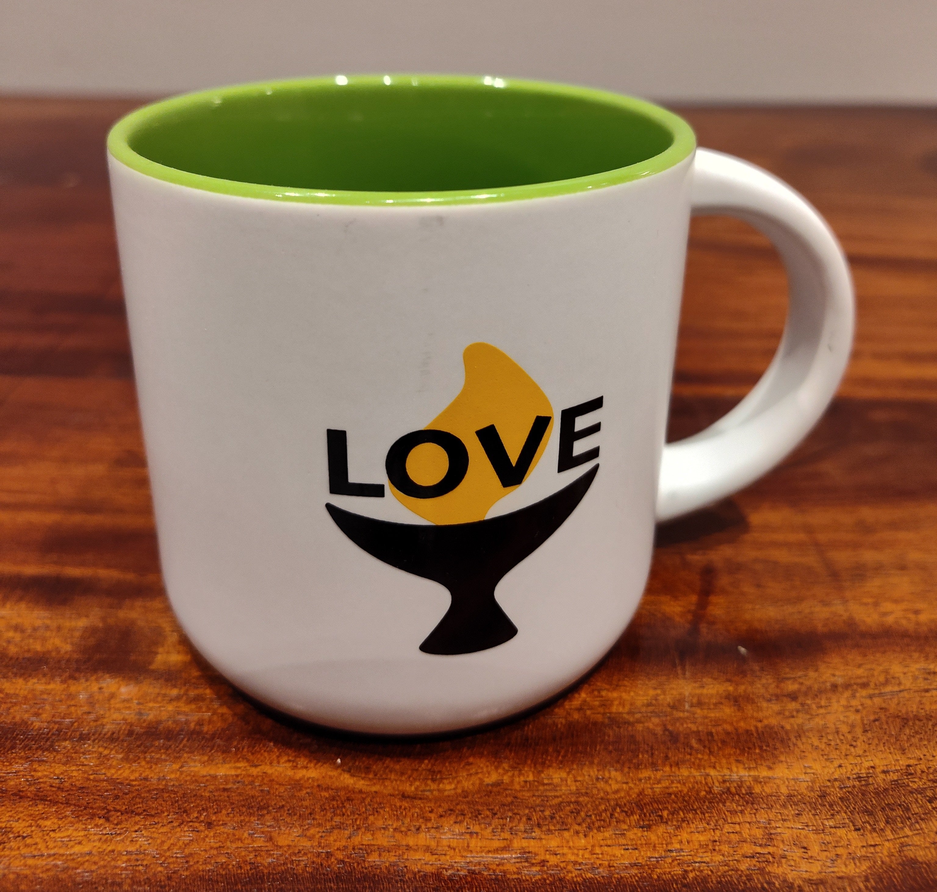 This lovably attractive, sturdy, 14-oz ceramic Minolo mug features a matte white exterior; a green glossy interior, and our Tanya Webster-designed “love chalice” in black and yellow – emphasizing that love is at the center of our shared Unitarian Universalist values. Complete with a large, curved handle for a comfortable grip.
