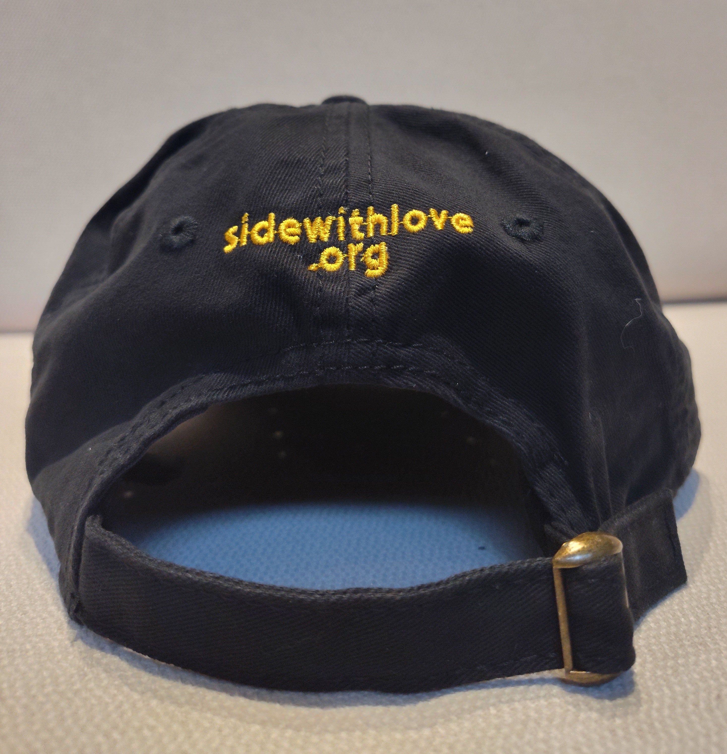 Side with Love with our Rainbow Heart black baseball cap. Embroidered with the SWL rainbow heart on the front and 'sidewithlove.org' on the back. One size fits most with adjustable strap.
