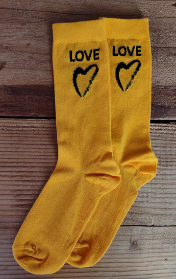 Proclaim your commitment to justice in warm comfort! These comfortable and stylish socks feature the Side with Love logo on a yellow background. Material: 78% cotton, 21% nylon, and 1% spandex. One size fits most.