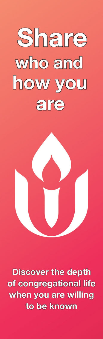 A bookmark to highlight the variety of reasons to speak with your Unitarian Universalist minister, encouraging congregation members to connect with their clergy in times of joy or difficulty, to learn and to share in blessings. The ministry of Unitarian Universalist congregations is inherently collaborative, and all community members can share in ministry by connecting with their church leaders. Whether seeking support, joining in celebration, sharing gratitude, or offering assistance, this bookmark serves as a reminder of the many opportunities to connect with your minister.